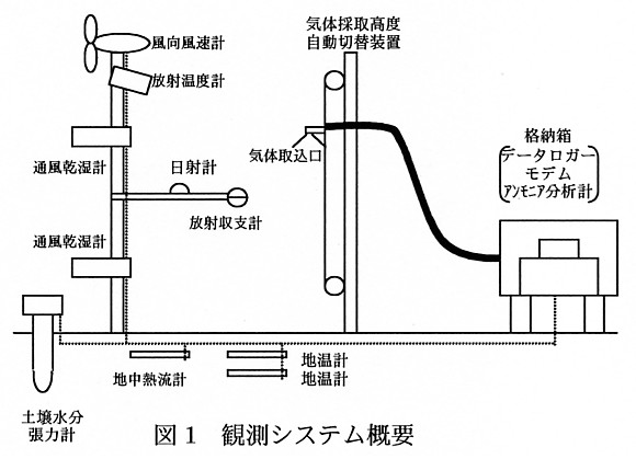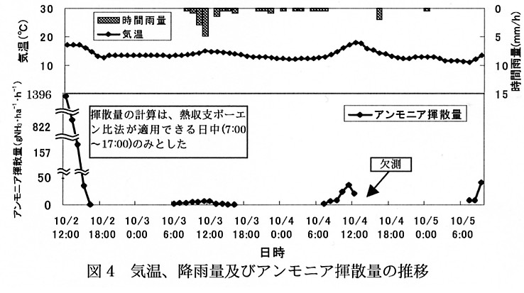 - この手法ではアンモニア揮散量を、上下2高度間のアンモニア濃度差と熱収支ボーエン比法で得られるこの2高度間の輸送係数の積として求める。