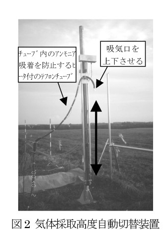 - 分析計への導入部にはアンモニアの吸着の少ないテフロンチューブを使用し、チューブ内での結露防止のため温度調節の可能なヒーターを巻き、断熱材で被覆する。また、気体取込口そのものを上下させる構造としており、アンモニアが吸着されやすいコック・バルブ類は使用していない(図2)。