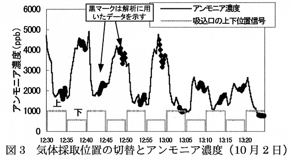 - 大気試料の取込口が上下方向に移動したのち、分析計の指示値が安定するまでには約2分を要する。これを含めて、上下の切り替えは約5分間隔が適当である(図3)。