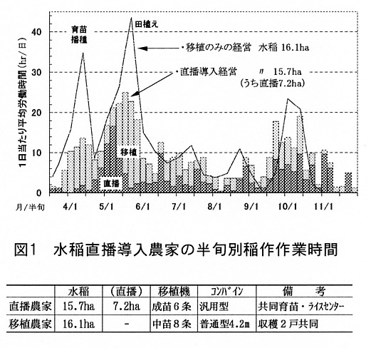 - 移植栽培では育苗播種と田植作業時に著しい作業ピークが形成されている。乾田直播の導入により,春作業の労働ピークが平準化され,夫婦2人で稲麦20ha規模の作業が可能な水準になっている(図1)。