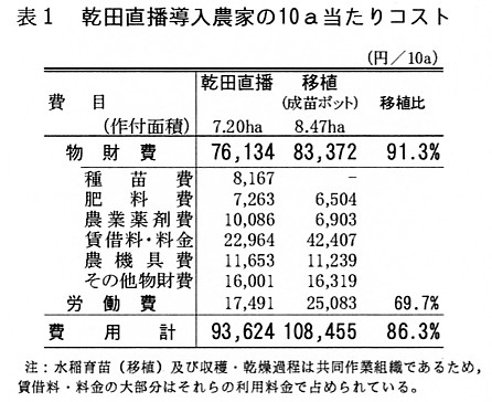 - 10a当たり生産コストでは,労働費を含めた費用合計で移植対比14%の低減効果が認められる。物財費合計では,粉衣剤・除草剤経費が増加するものの育苗関連経費が大幅に削減され,また直播専用機械の共同利用によって減価償却費が抑えられ,9%のコスト低減を実現している(表1)。