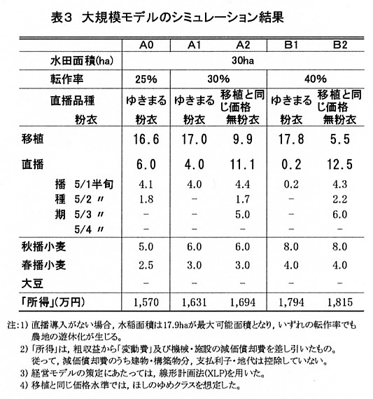 - 新たな「水田農業経営確立対策」においては,米の需要動向に対応した水田利用が求められる。大規模モデル(経営面積30ha,稲・麦・大豆)では,移植栽培のみの場合は稲作面積が約18haで限界となる。直播を導入した場合,収量水準が移植栽培より30kg/10a低い510kg/10aとしても,6ha程度の直播面積が最適導入規模となり,稲作面積の拡大につながる(転作比率が25%のケース)。また,転作比率の変動に対しても直播面積の増減による対応によって,柔軟な土地利用計画が可能となる。さらに,移植品種と同等の価格水準と無粉衣播種程度のコスト削減が実現されれば,直播栽培を主体とした作付構成に転換する可能性が示される(表3)。