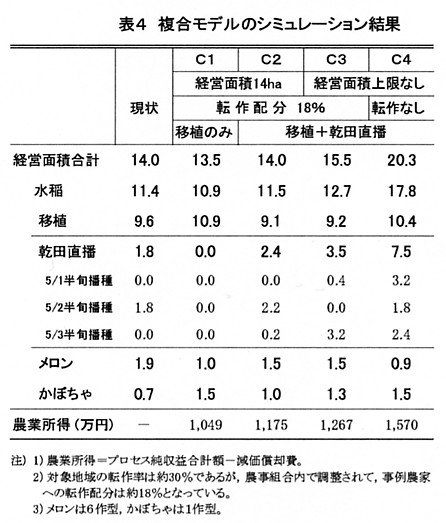 - 複合モデル(経営面積14ha,稲・メロン・かぼちゃ)では,乾田直播を導入することにより,経営面積が維持されるとともにメロンの作付拡大も可能となる。また,転作割当が無いと仮定すると,乾田直播は7.5haまで導入され水稲作付面積も大きく増大する(表4)。
