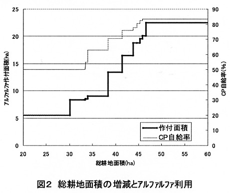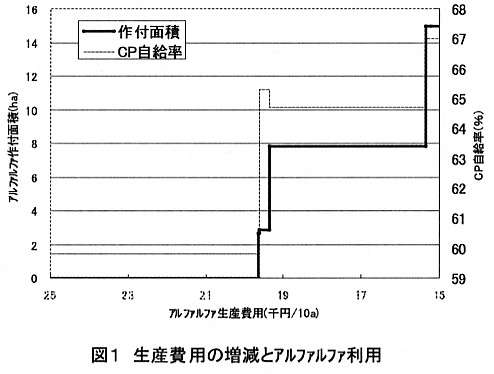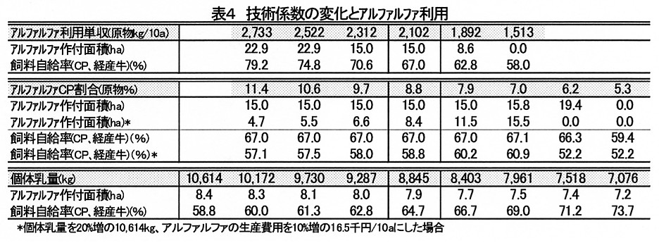 - 畑地型酪農経営にアルファルファが10ha程度以上導入されるためには、計画モデルで設定した基準(表1〜3)に対して、アルファルファサイレージの10aあたり利用収量は10%減の約1,900kg(乾物では750kg)以上、CP(粗蛋白質)割合は30%減の6.2%(乾物では約15%)以上、生産費用はチモシーの生産費に較べて20%増(1.2倍)以内が条件になる(表4、図1)。