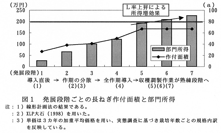1)長ねぎ作の規模拡大は収穫調製作業の能率に規制される側面が強い。収穫調製作業が熟練し能率の高い経営では、作期を分散させることで年間70aの作付けが可能となり、目標所得に到達する(図1)。また、栽培年数が増すにつれてL規格率が高まることから、目標所得を超すことが可能となる。長ねぎ作の規模拡大には、収穫調製作業の処理能力と栽培管理技術の習熟に合わせた漸進的な拡大が望ましい。