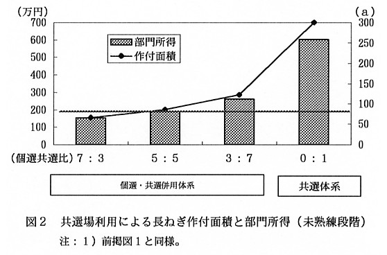 2)収穫調製作業が未熟な段階では、共選場を利用し90aの作付けにすると、目標所得の確保が可能となる(図2)。熟練度が不足する新規参入の経営に長ねぎ作を定着させるためには、共選体制の整備と共選品の品質維持が必要となる。