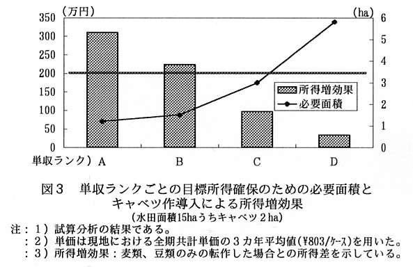 2)小麦と大豆を優遇した転作制度の下でも、2haの作付面積とBランク以上の単収にあるならば、夏季兼業及び小麦と豆類のみの転作に比べて、キャベツ作導入の方が有利となる(図3)。