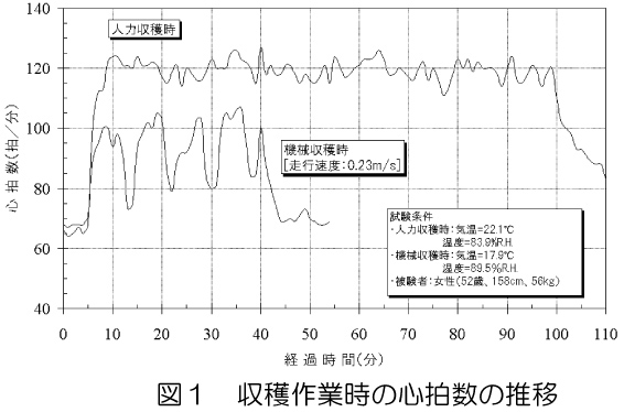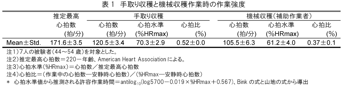 また、機械収穫作業者の疲労から推定される許容作業時間*の目安は約100分である。