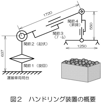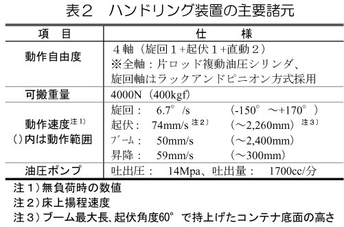 - 開発したハンドリング装置(表2・図2)は油圧シリンダ駆動による4自由度の極座標型多関節アーム機構である。本装置の利用場面は、トラクタ牽引トレーラに架装し、収穫機に伴走して順次コンテナを荷降し・積込むこと(積載個数:4個以上)を想定する。
