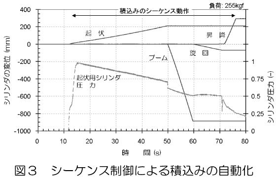 装置は有線式リモコンで遠隔操作できる。また、リレーシーケンス制御により、各関節を分担動作させてコンテナを自動的に50〜60秒/個で荷台に積込む(図3)。