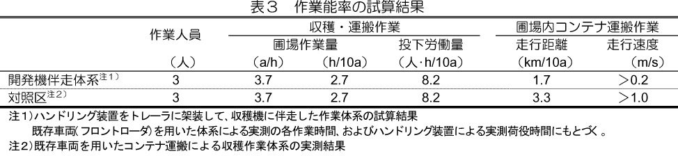 - 装置をトレーラに架装したときの収穫伴走体系(開発機伴走体系)では、フロントローダ等既存の運搬車両を用いたコンテナ運搬体系(対照区)と同程度の作業能率2.7h/10aである。また、複数個のコンテナを順次積載して運搬サイクルを単純化させることから、運搬に要する総走行距離を対照区の約半分に短縮して(表3)、投下エネルギ量を低減する。