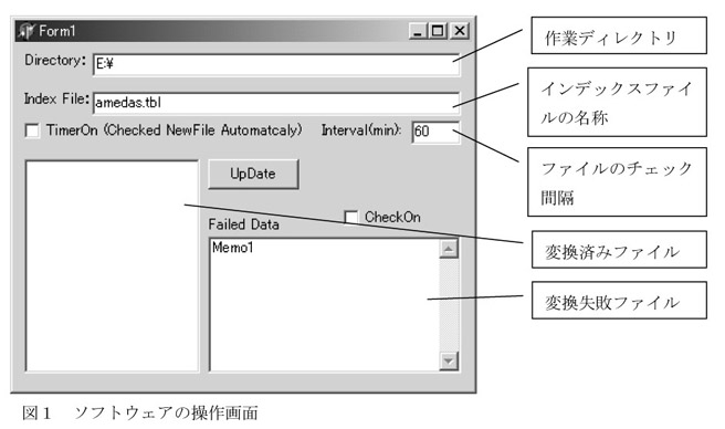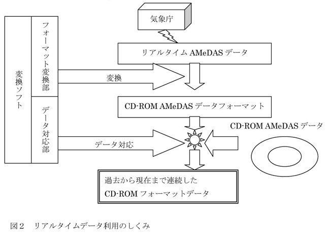 そこで,リアルタイムデータをCD-ROM AMeDASデータのフォーマットに自動的に変換するソフトウェアを開発し,CD-ROM AMeDASデータ対応のソフトウェアで過去から現在まで連続したデータを利用できるようにする。