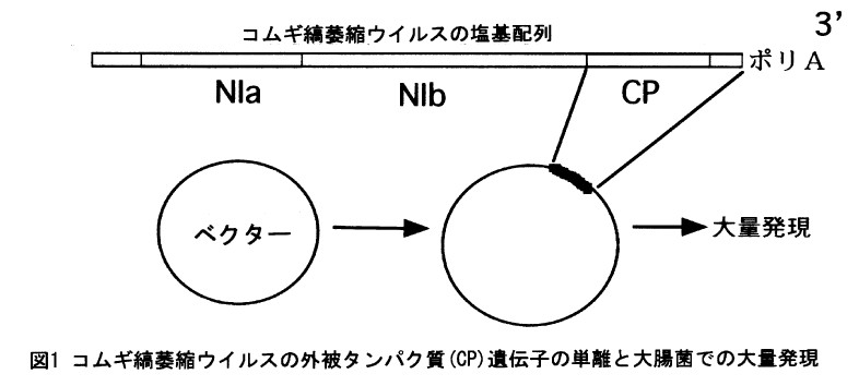 - コムギ縞萎縮ウイルスの外被タンパク質遺伝子を単離し、遺伝子組換え技術によって、大腸菌でウイルス抗原を大量に発現させ、抗体を作成した。作成した抗体によるエライザ法で、コムギからウイルスを検出できる。