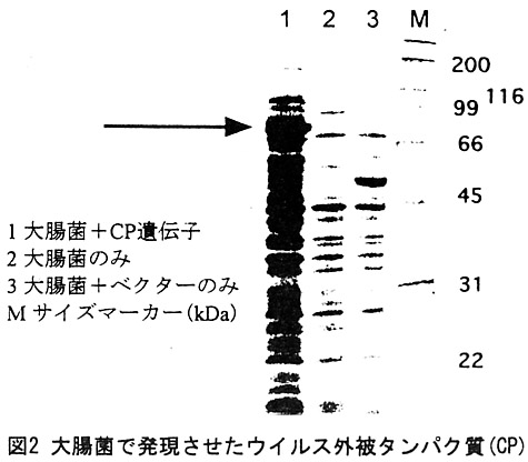 - 単離したCP遺伝子を大腸菌に組み込んだところ,コムギ縞萎縮ウイルスの外被タンパク質(CP)を大量に発現させることができた(図2)。大量発現したCPをカラムで精製して,抗血清作成のための抗原を得た。