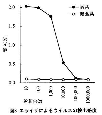 - 得られた抗原をウサギに免疫し,抗血清(抗体)を作成した。作成した抗体を用いたエライザ法によって,病葉の10,000倍希釈液からもウイルスを検出できる(図3)。