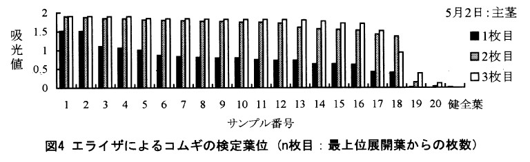 - エライザによるコムギからのウイルス検出部位を検討した結果,最上位展開葉では吸光値が低下し(図4),葉身部位では先端で吸光値が高まった。したがって,エライザ検定は,最上位展開葉の1枚下の葉の先端部を検定用サンプルとする。