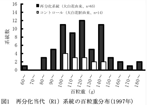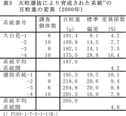 - 再分化個体からの大粒選抜によって、原品種より明らかに百粒重の重い系統が選抜育成されている(表3)。