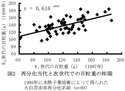 - 再分化当代の百粒重は、体細胞変異体出現の可能性を期待できる広い分布幅を示す(図1)。また、再分化当代と次世代の百粒重に正の相関関係が認められ(図2)、再分化当代での大まかな粒大選抜が可能と思われる。