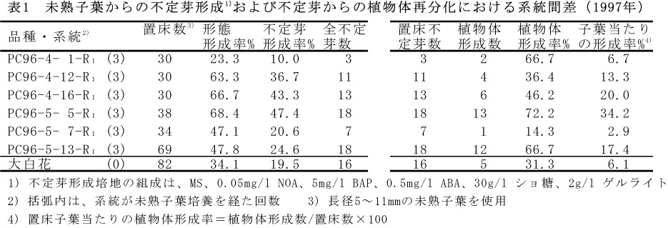 - 未熟子葉培養により再分化した植物体あるいはその後代より未熟子葉を採取した培養では、不定芽形成率、植物体形成率ともに高まる場合が多い(表1)。置床外植片当たりの植物体形成率が30%を越える再分化系統もみられる。