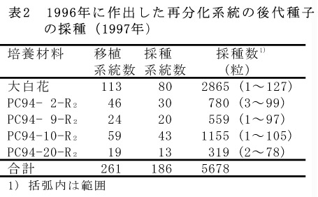- 再分化個体を節培養により数個体に増殖し、温室へ鉢上げ後、圃場へ移植すると、湿害の影響がないときには順調に生育し、移植系統の70〜85%から後代種子を得ることができる(表2)。