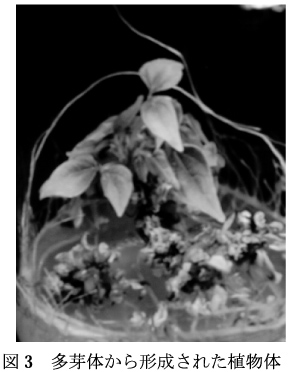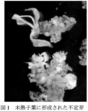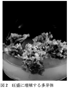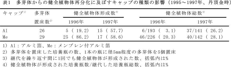 - 不定芽から直接植物体が再分化する事はなく、旺盛に生育する多芽体を形成する。多芽体からの鉢上げ可能な健全植物体の再分化には、培養瓶のキャップとしてメンブレン付アルミ箔の使用が効果的である(表1)