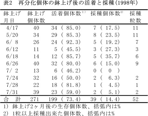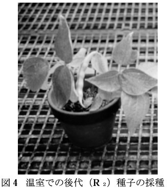 - 再分化植物体を温室に鉢上げし、後代種子を採種することができる(図4)。しかしながら、鉢上げ後の活着、生育が悪い個体が多く、採種個体率は低い(表2)。