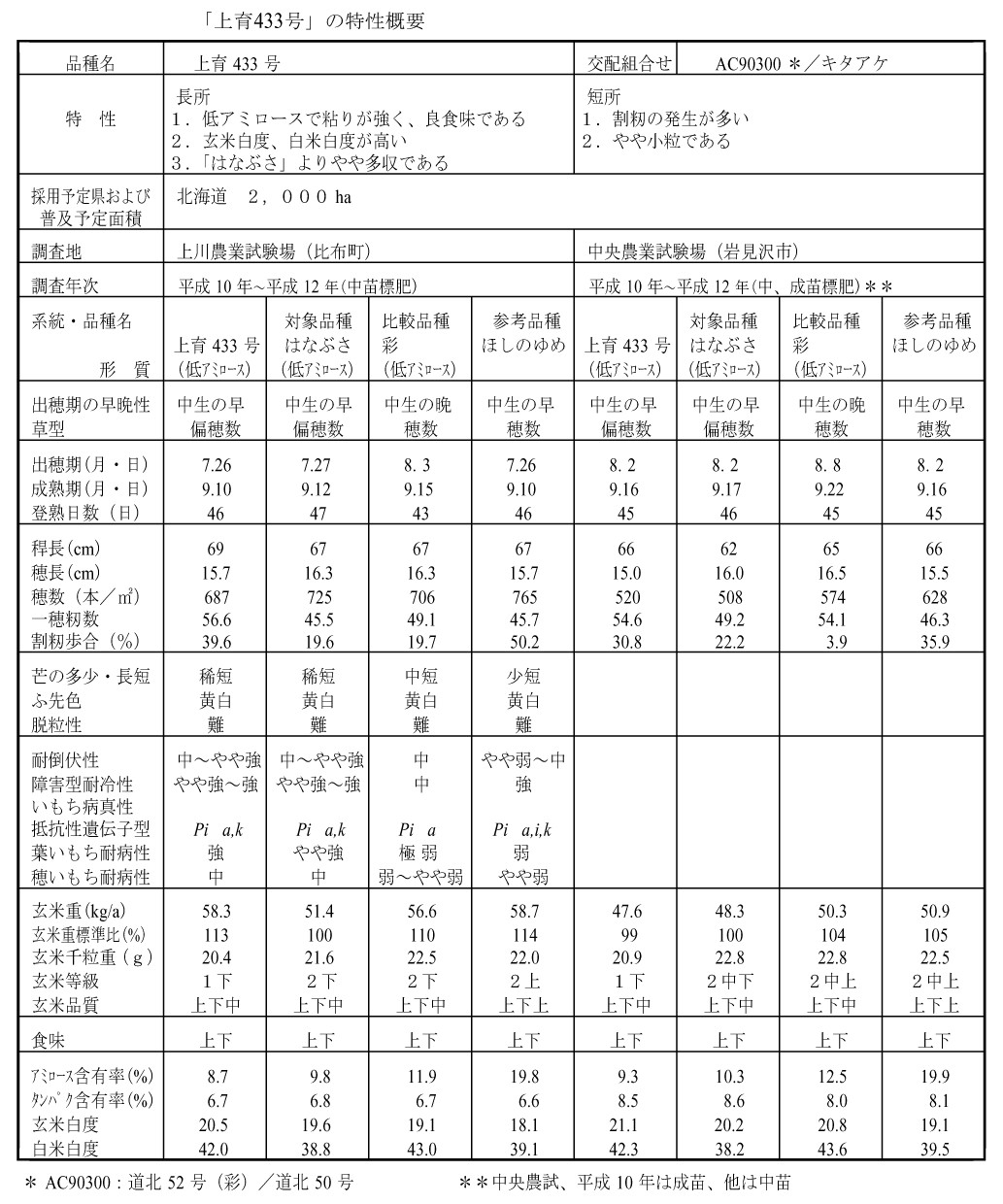 - 水稲「上育433号」はAC90300/キタアケの交配組合せから選抜された中生の良食味低アミロース系統である。