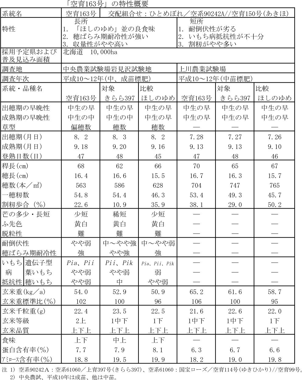- 水稲「空育163号」はひとめぼれ/空系90242A//空育150号(あきほ)の組合せのF1を、生物工学部(当時)で葯培養により育成した材料より選抜した中生の良食味粳系統である。