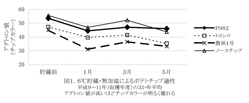 - ばれいしょを用いた油加工食品の多くを占めるポテトチップには、「トヨシロ」及び「農林1号」が多く使われているが、これらの品種は低温で貯蔵した場合、貯蔵中に還元糖含有率が高まり、油加工時に製品の色を劣化させる。このため比較的高温で貯蔵されているが、この場合貯蔵中の芽の伸長や原料の減耗などのロスが大きく、低温貯蔵でも還元糖含有率が高まらない難糖化性品種が切望されている。近年、難糖化性品種として「ホワイトフライヤー」が品種登録され、「ノースチップ」及び「スノーデン」が奨励品種となったが、いずれも収量性が劣り、ジャガイモシストセンチュウ抵抗性を持たないなどの欠点を有していた。