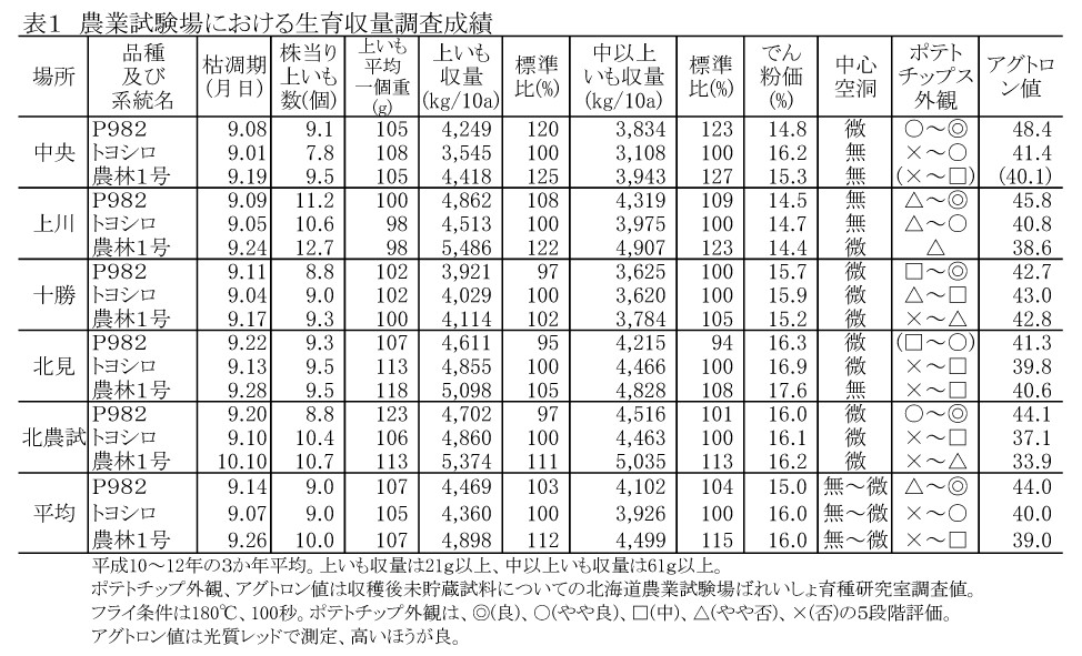 - 平成3年に北海道農試で早生・難糖化性の「島系560号」(後の「ホワイトフライヤー」)を母、中生・大粒・多収の「島系558号」(後の「さやか」)を父として交配され、翌年以降ホクレン農業協同組合連合会で選抜された。「P982」は中生で中以上いも重はほぼ「トヨシロ」並である。でん粉価は「トヨシロ」並からやや低い(表1)。