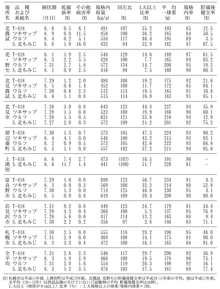 - 貯蔵性:貯蔵後健全率は高貯蔵性の「ツキサップ」、「スーパー北もみじ」より劣るが、「ウルフ」より優る。