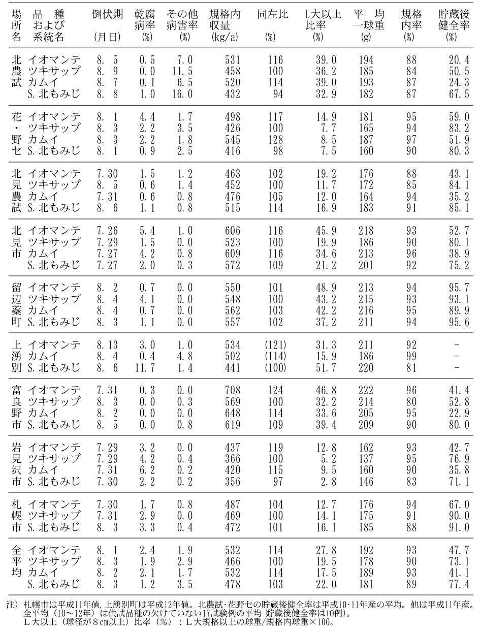- 貯蔵性:貯蔵後健全率は高貯蔵性の「ツキサップ」、「スーパー北もみじ」より劣るが、「カムイ」よりやや優る。