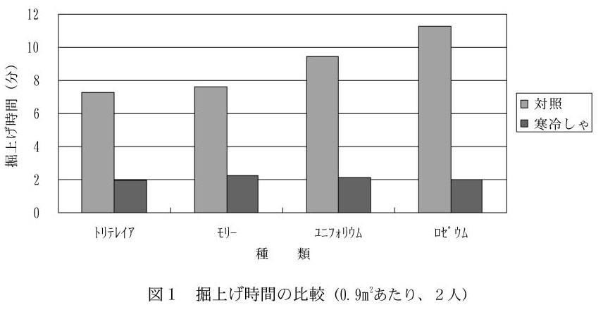 - 掘上げ時間:慣行法では小球種ほど掘上げに時間を要するのに対し、寒冷しゃを用いた場合の掘上げ時間は球種に関係なくほぼ同一で、慣行法の1/4〜1/6に短縮する(図1)。
