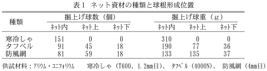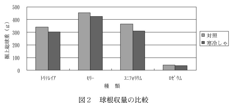 - 掘残し球の発生状況:ネット資材の種類によってはネットの上下に新球が形成されるが、寒冷しゃ(T600)ではネット外部での球根形成は見られない(表1)。