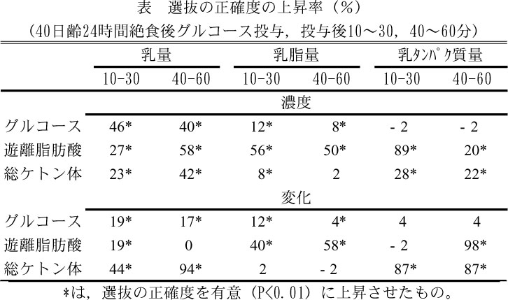 研究課題名:乳牛の育成期選抜のためのインディケータの探索 予算区分 :経常 研究期間 :平成8〜12年度 研究担当者:佐々木修,富樫研治,山本直幸 発表論文等:泌乳能力予測のためのインディケータ形質測定条件.日本畜産学会報,68(9),p843-852(1997) 5ヶ月齢時の絶食による血中代謝成分濃度変化量と乳量の育種価との関係.日本畜産学会報,69(5),p450-459(1998) 血縁情報が不完全なホルスタイン種牛群における泌乳形質の育種価の推定.日本畜産学会報,70(8),pJ97-J105(1999)