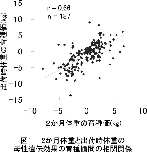 直接遺伝効果の遺伝率は0.2と中程度の値であるが母性遺伝効果の遺伝率は0.1以下の低い値である(表2)。しかし2か月と出荷時の母性遺伝効果の育種価間の相関が高いことから子牛市場出荷成績を用いた種雄牛の哺育能力の育種価評価は可能である(図1)。