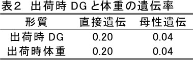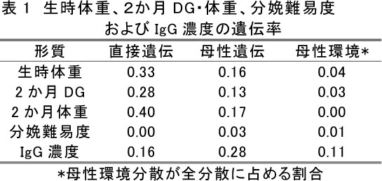 分娩難易度の遺伝率は非常に低く育種価評価は困難である。生後2日目のIgG濃度の母性遺伝効果の遺伝率は約0.3と中程度の値であり(表1)、2か月DGの母性遺伝効果の育種価との間には高い相関が認められる(r=0.68)。