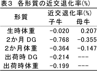 子牛と母牛の近交係数は子牛の発育に負の影響を及ぼしており、近交退化率は2か月齢で大きい(表3)。市場で低く評価される系統内交配もあるので、近親交配は可能な限り避けるべきである。