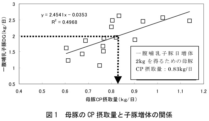 - 授乳期母豚の窒素摂取量の増加に伴い子豚の日増体重は高まった(R2=0.50)。哺乳頭数10頭で期待増体量を2kg/日とした場合、これに必要な母豚CP摂取量は0.83kg/日と推定され、母豚の飼料摂取量が4.76kg/日(100kg/3週間)のときの飼料CP含量は17.4%