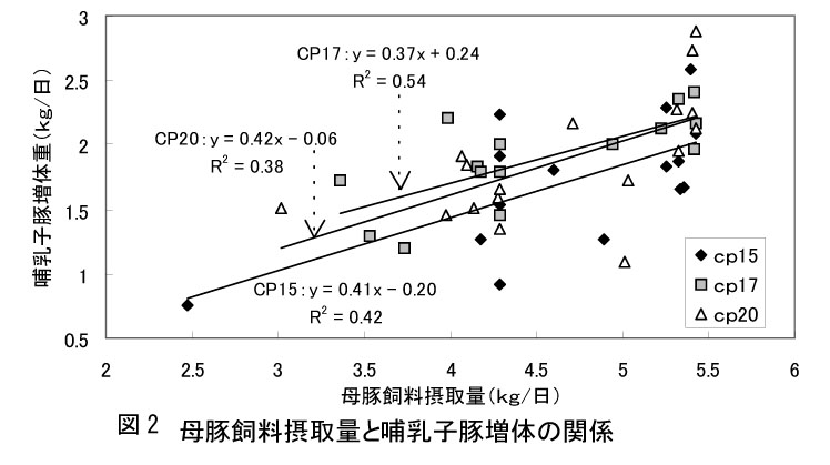 - 母豚飼料摂取量に対する哺乳子豚の日増体重の回帰において、CP17%飼料給与時の回帰の高さは、CP15%飼料給与時に比較して有意に高く、飼料摂取量が同等の条件では15%飼料に比較して17%給与時の子豚の発育は高まった(図2)。