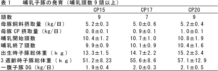 - 授乳期の母豚(大ヨークシャー、初産および2産)に、CP含量15%、17%、20%の飼料を給与した時の哺乳子豚の増体重は、有意な違いはなかったが、15%飼料に比較して17%または20%飼料給与で高くなる傾向にあった(表1)。