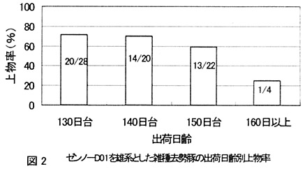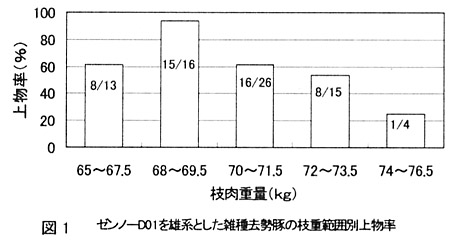 - 「ゼンノーD01」を雄系とした交雑豚の枝肉上物率は、雌では枝肉重量65〜79.5kgの範囲で同等であった。去勢は出荷日齢が早く枝肉重量72kg未満のものが良好であり(図1、2)、肥育期に飼料の制限を行わず、体重106〜110kgで出荷するのが良いと思われた。