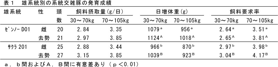 - 「ゼンノーD01」を雄系統とした系統間交雑豚の日増体重および飼料要求率は、肥育前期および後期ともに良好であり、「サクラ201」を雄系統としたものに比べ優れる(表1)。