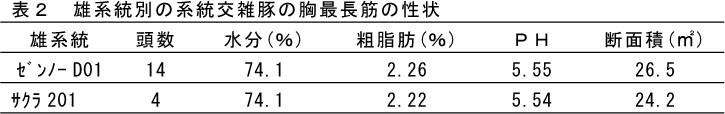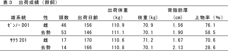 - 出荷枝肉の成績は、「ゼンノーD01」を雄系とした交雑豚の枝肉上物率が優れた(表3)が、背脂肪厚は、サクラ系およびゼンノー系で同等である。また、交雑肉豚の胸最長筋の水分含量、粗脂肪含量、およびPHは、交配雄系統による違いはない(表2)。