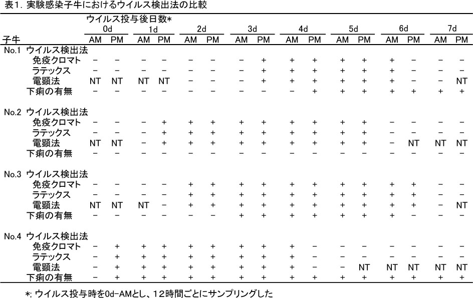 - 牛ロタウイルス実験感染子牛において、免疫クロマトグラフィー法とラテックス凝集法による糞便中ウイルスの検出時期は一致した。ウイルス投与後12時間〜3日目から子牛糞便中にウイルスが検出され、ウイルスの排泄は3〜5日間持続した。陽性と判定された検体はすべて電顕法でロタウイルス粒子が確認された(表1)。