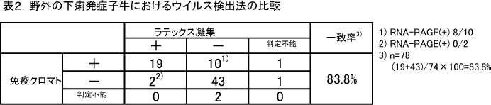- 野外での下痢発症子牛において、免疫クロマトグラフィー法とラテックス凝集反応法による糞便中ロタウイルスの検出結果の一致率は83.8%であった(表2)。