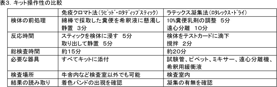 - 免疫クロマトグラフィー法による牛ロタウイルス検出キットは、操作が簡単で総検査時間も短く、検査室以外の場所でも使用可能である(表3)。