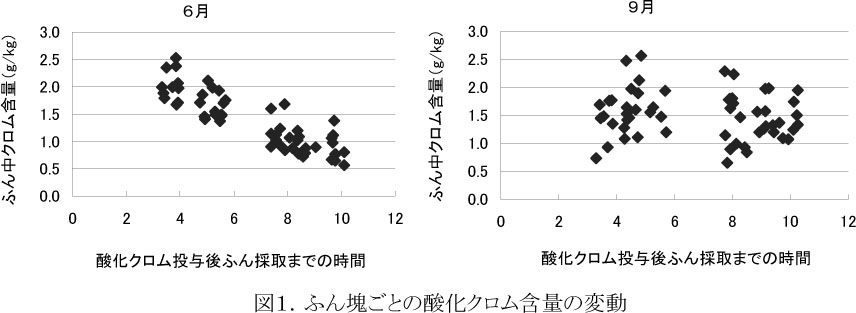 - 乾草・サイレージ給与時に投与した酸化クロムの平均回収率は100%であった。放牧時のふん塊ごとのクロム含有率には日内変動・日間変動がみられるため(図1)、排ふん量推定には、排ふんごとに試料を採取し、ふん塊ごとのクロム含有率の平均値を用いることが望ましい。