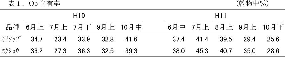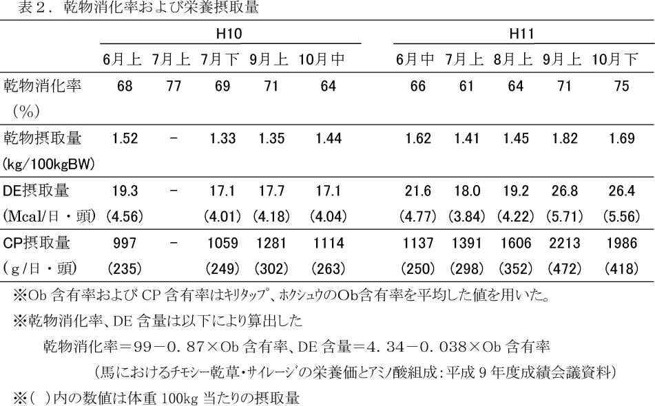 - Ob含有率から推定した採食部位の乾物消化率は61〜77%、可消化エネルギー(DE)含量は2.69〜3.39Mcal/kgの範囲にあった(表1・2)。