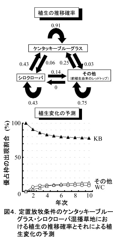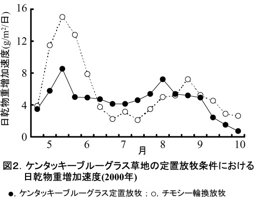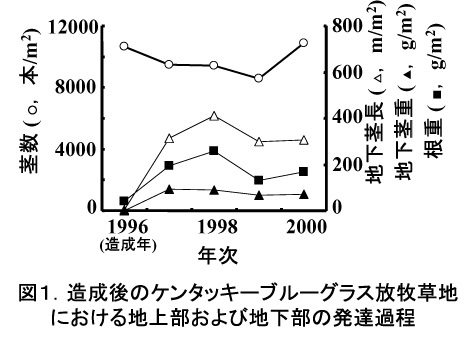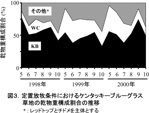 研究課題名:北海道における持続型放牧草地の植生管理技術の開発 予算区分 :経常・畜産対応研究(自給飼料基盤) 研究期間 :平成12年度(平成9〜15年) 研究担当者:三枝俊哉・手島茂樹・小川恭男・高橋 俊 発表論文等:1.三枝俊哉・手島茂樹・小川恭男:持続型放牧草地としてのケンタッキーブルーグラス草地の再評価1. 放牧方法の異なるケンタッキーブルーグラス草地とチモシー草地の草種構成と家畜生産性,北海道草地研究会報,33,52(1999) 2.三枝俊哉・手島茂樹・小川恭男・高橋 俊:持続型放牧草地としてのケンタッキーブルーグラス草地の再評価2. 定置放牧条件における牧草および家畜生産性,北海道草地研究会報,34,78(2000)